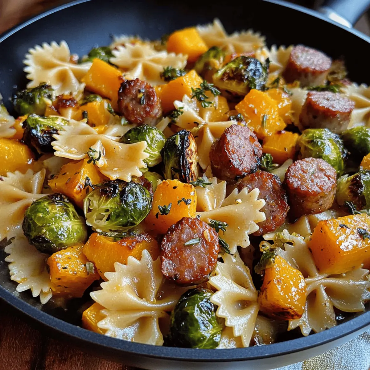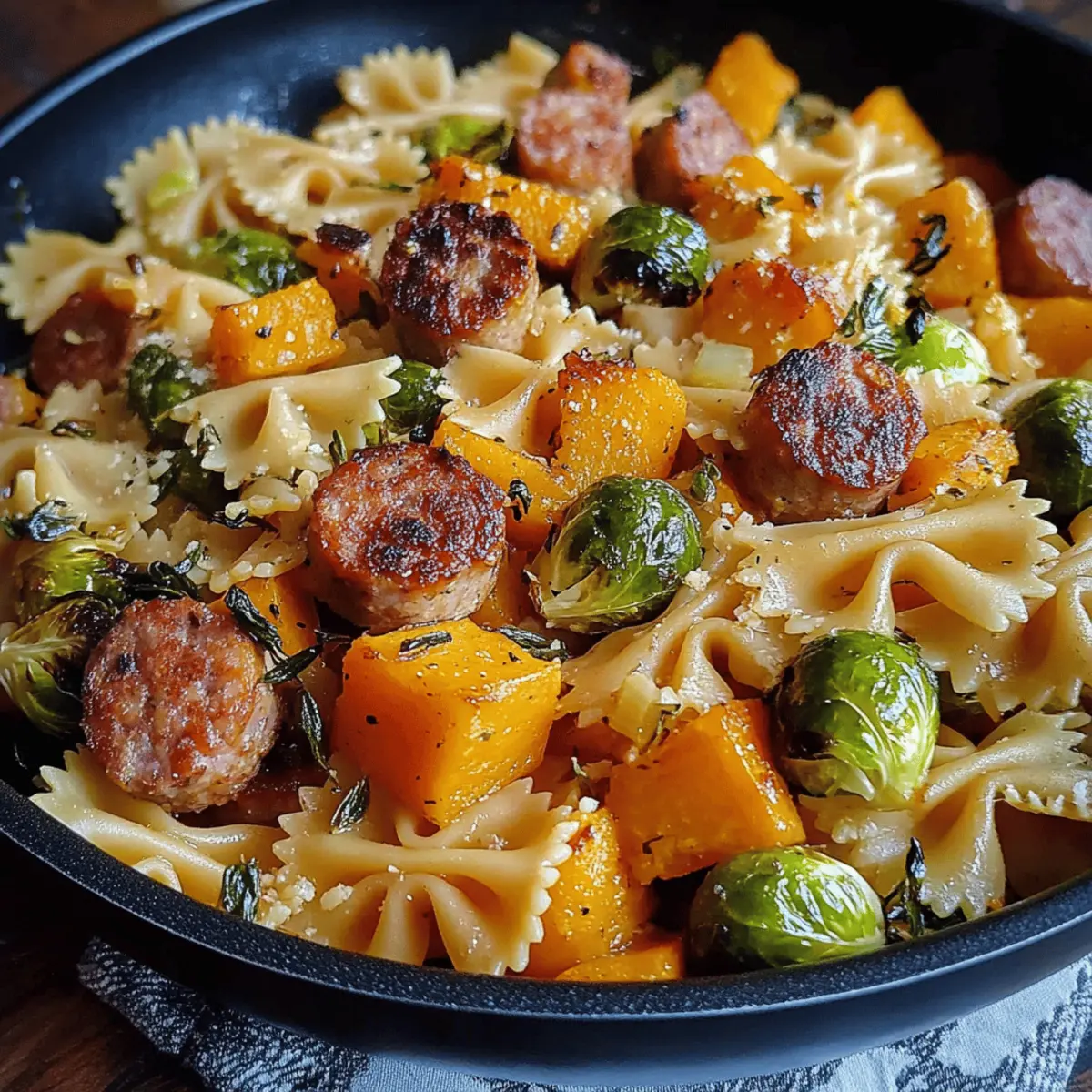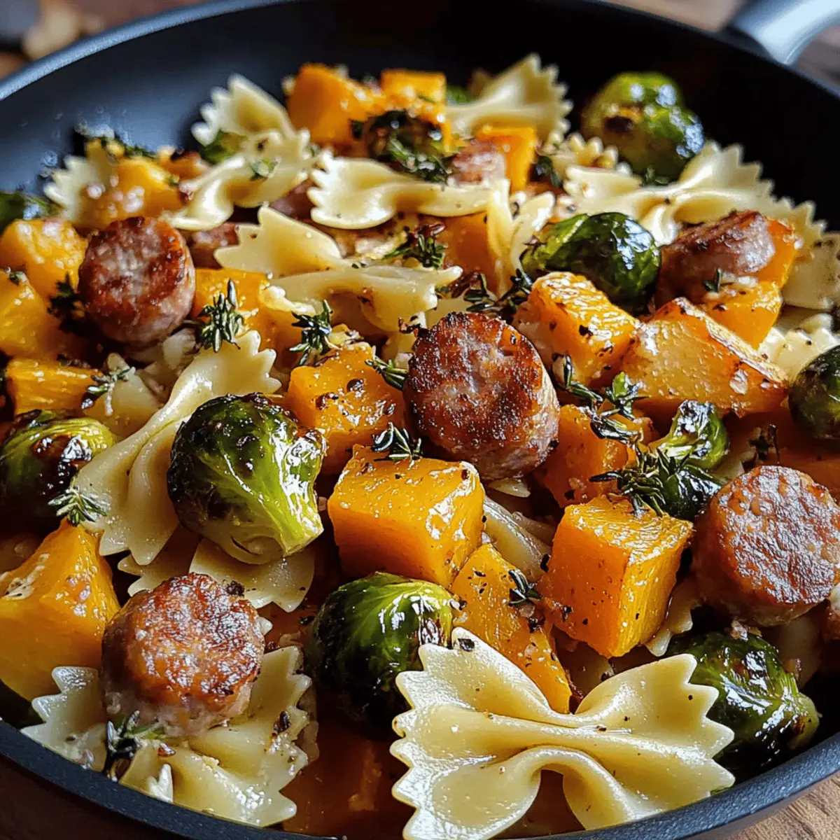 Add the drained pasta, roasted butternut squash, Brussels sprouts, and cooked sausage into the skillet with the garlic butter sauce. Toss everything gently to combine, and gradually add reserved pasta water, mixing until you have a well-coated, cohesive dish. Adjust seasoning with additional salt and pepper as needed, ensuring the flavors of the Autumn Sausage Pasta Squash are just right.