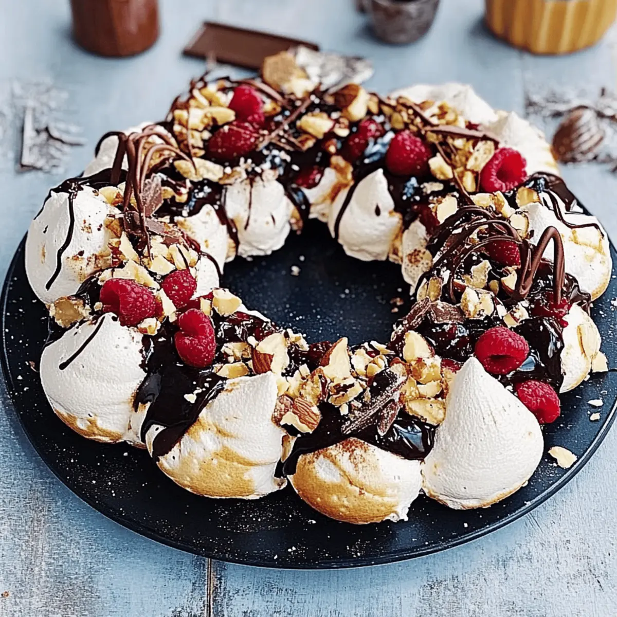 - Transfer the cooled meringue to a platter. Layer with fruit compote, drizzle melted dark chocolate, and sprinkle with nuts and chocolate curls.