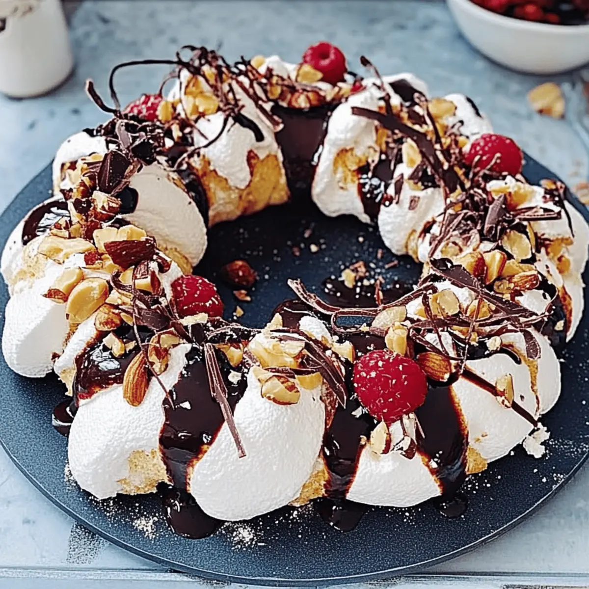 Once the meringue is cool, carefully transfer it to a serving platter. Layer the cooled fruit compote generously on top, followed by a drizzle of melted dark chocolate, ensuring even coverage. Sprinkle caramelized nuts and chocolate curls over the top for added texture and decoration.