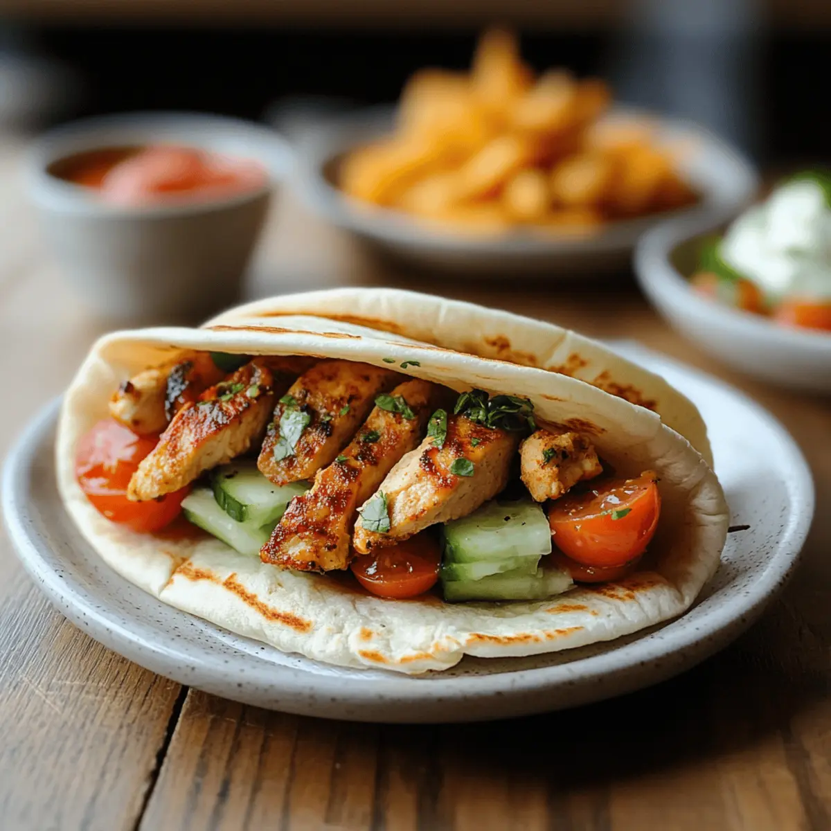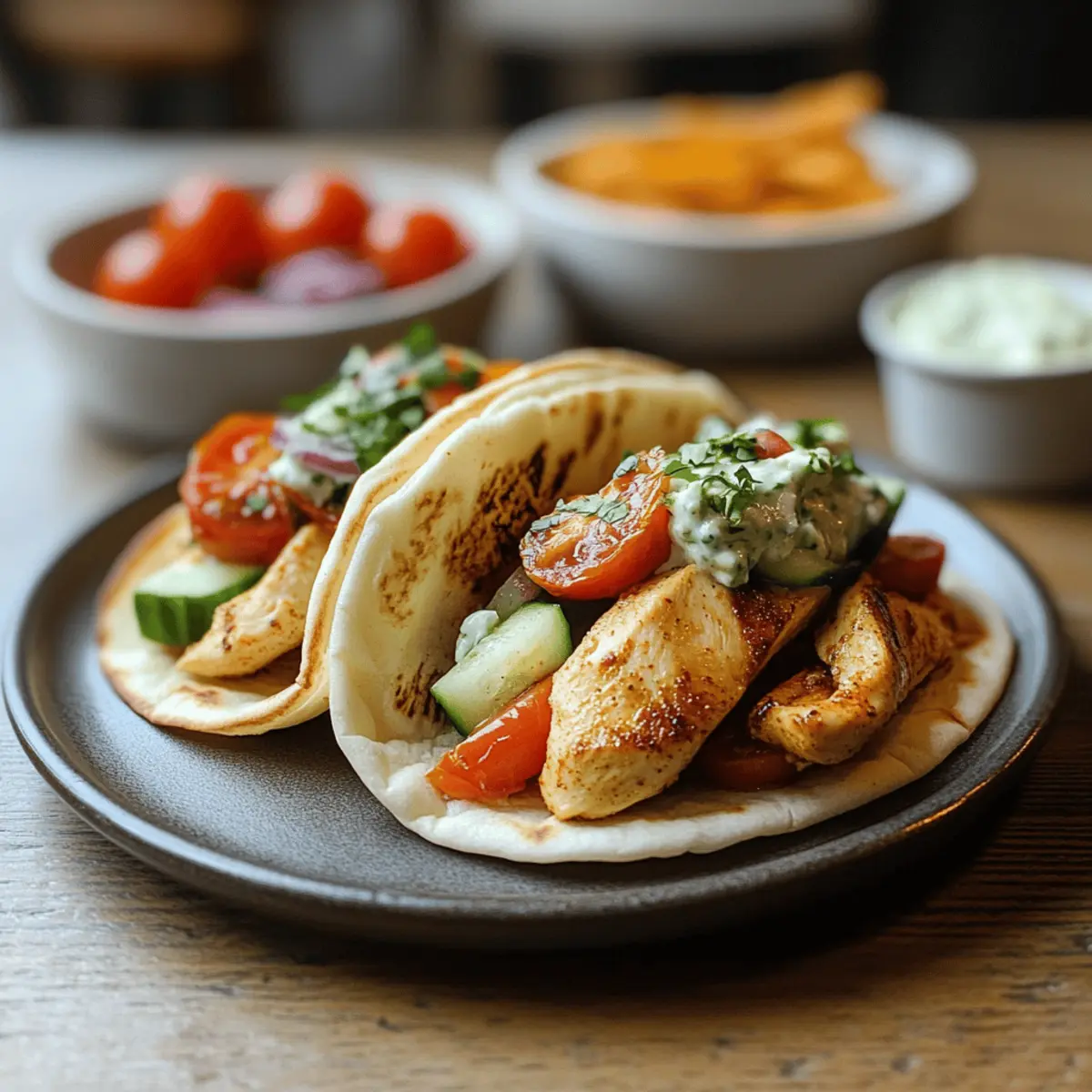 Slice the cooked chicken into strips and set aside. Take warm pita bread and spread a generous layer of the creamy feta tzatziki on each one. Layer the sliced chicken, followed by fresh cherry tomatoes, diced cucumber, and red onion atop the tzatziki. Roll the pita tightly around the filling to create your delicious Chicken Gyros, ready to be savored!