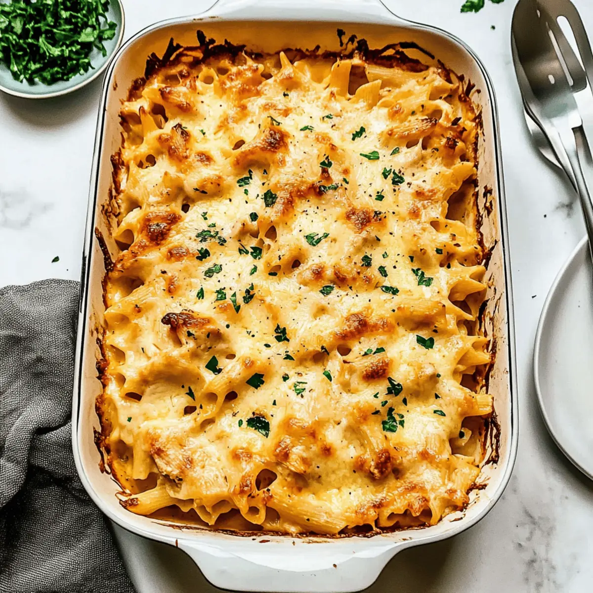 Begin by preheating your oven to 400°F (200°C). While it warms up, take a 9×13-inch baking dish and grease it lightly with butter or cooking spray. This will ensure your glorious Chicken Pasta Bake doesn’t stick to the bottom, allowing for easy serving once it’s bubbling and golden.
