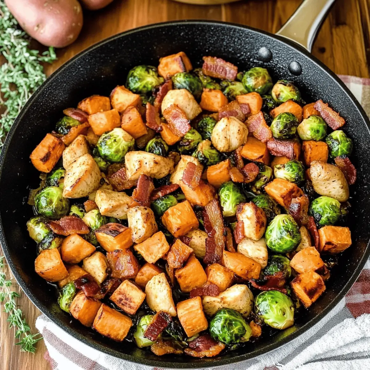 Savory Chicken Skillet with Sweet Potatoes and Brussels Sprouts