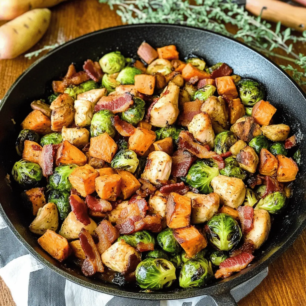 These Harvest Chicken Skillet with Sweet Potatoes and Brussels Sprouts are perfect for busy weeknights! You can chop the sweet potatoes, Brussels sprouts, and onions up to 24 hours in advance and store them in an airtight container in the fridge to maintain freshness. Additionally, you can pre-cook the bacon, crumble it, and keep it refrigerated until you’re ready to combine everything. When it’s time to serve, simply sauté the prepped vegetables, follow the cooking steps, and add the cooked chicken and bacon at the end to warm through. This way, you’ll enjoy a nutritious, homemade meal with significantly less effort!