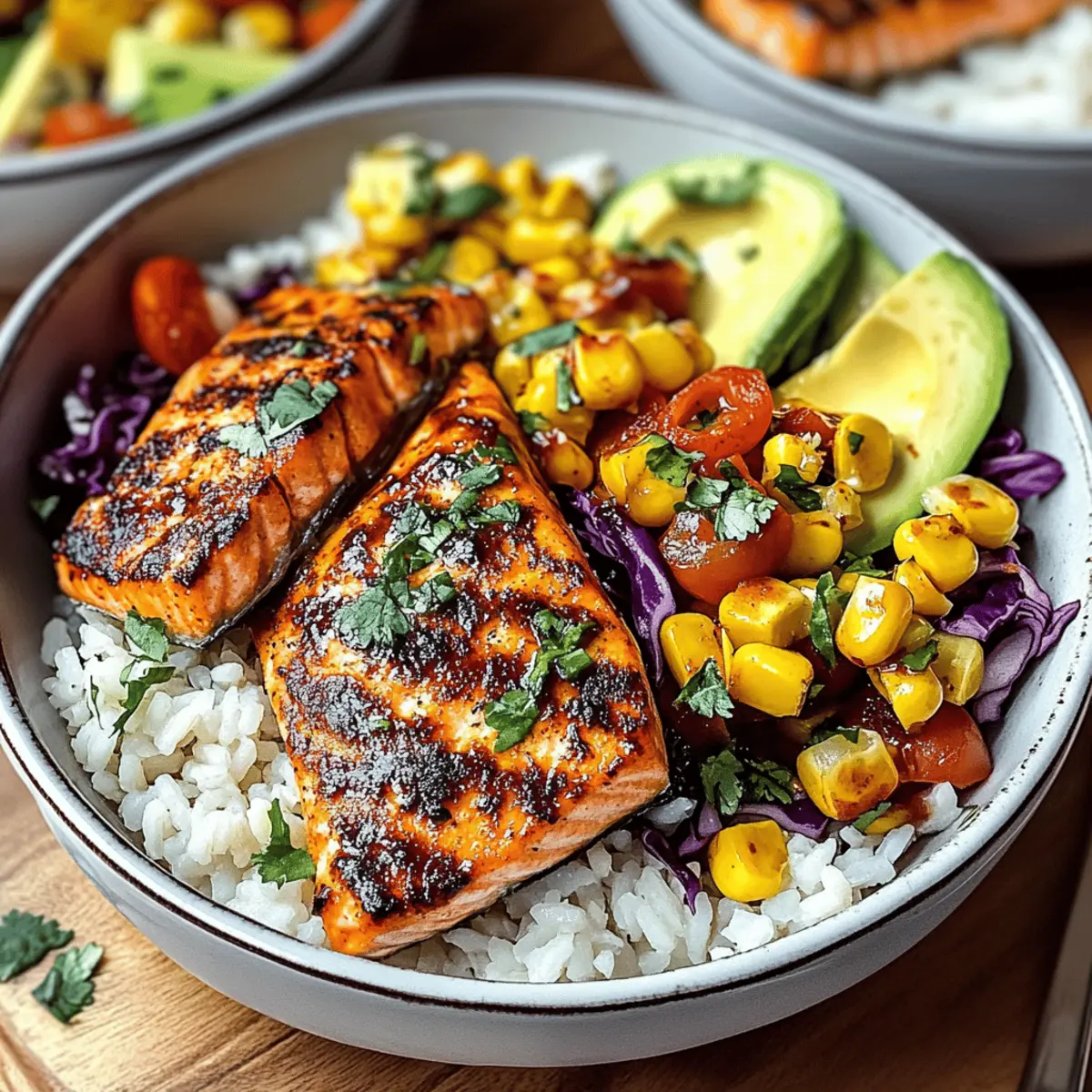 Begin assembling the Chili Lime Salmon Bowls by dividing 2 cups of cooked brown or white rice among four bowls. Top each portion of rice with a salmon fillet and arrange slices of creamy avocado, shredded purple cabbage, sweet corn, and juicy cherry tomatoes around the salmon. Sprinkle chopped cilantro and thinly sliced green onions on top for a fresh finish, creating a visually delightful presentation.