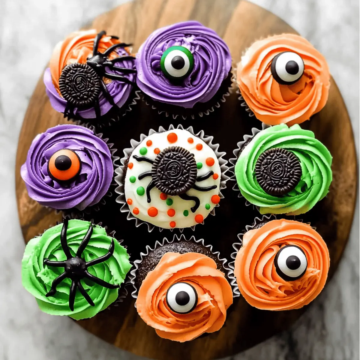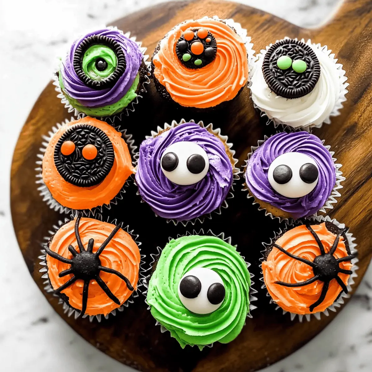 Spread a layer of white frosting evenly on the cupcakes designated for spiders. Use black frosting in a piping bag to create a web pattern on top. To create the spiders, carefully place mini Oreo cookies in the center of the cupcakes, and finish off with candy eyeballs for a spooky touch that brings your Halloween cupcakes to life.