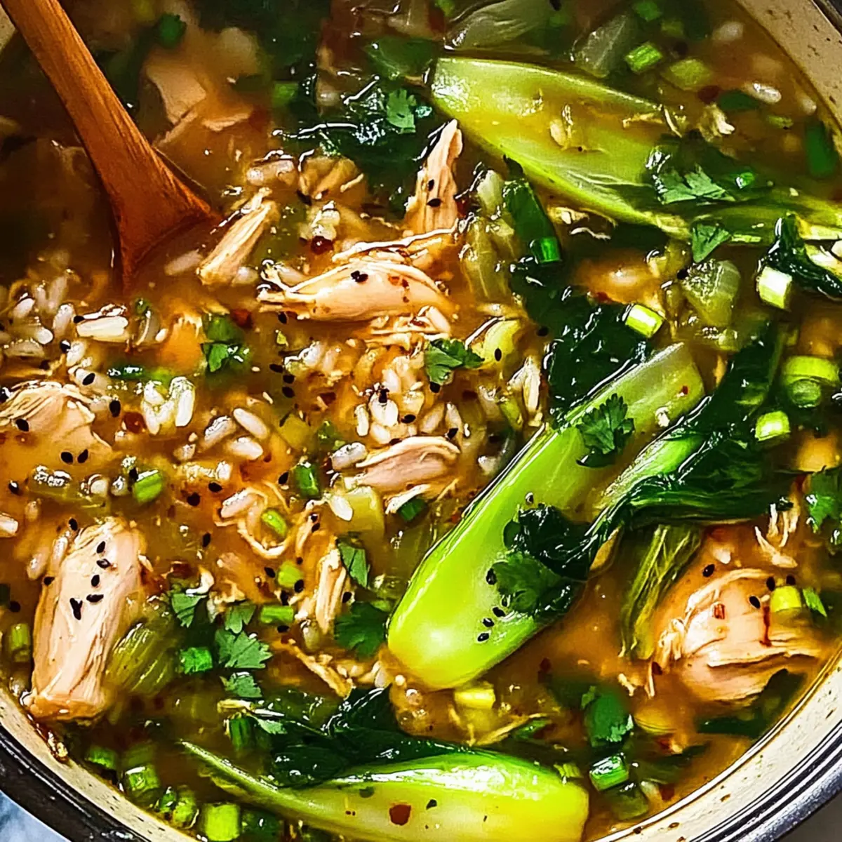 Stir in 2 cups of chopped baby bok choy and the green parts of 3 sliced green onions. Allow the soup to simmer uncovered for an additional 3-4 minutes until the bok choy is tender but still vibrant. This step adds a fresh crunch to your Ginger Chicken and Rice Soup.