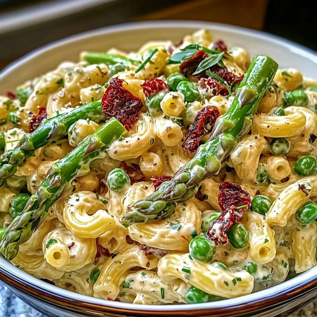 Stir in the roughly chopped sun-dried tomatoes to the cooled pasta and veggies, ensuring an even distribution of flavors. Cover the bowl with plastic wrap and chill the mixture in the refrigerator for 15-20 minutes, allowing the Lemon-Dijon Asparagus and Pea Macaroni Salad to develop a refreshing taste.