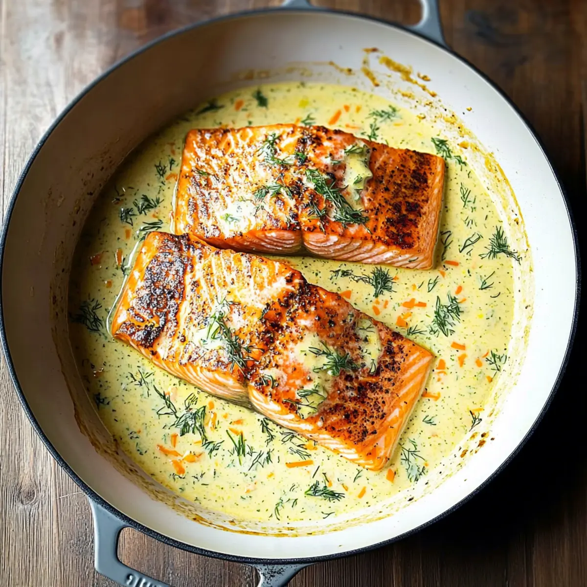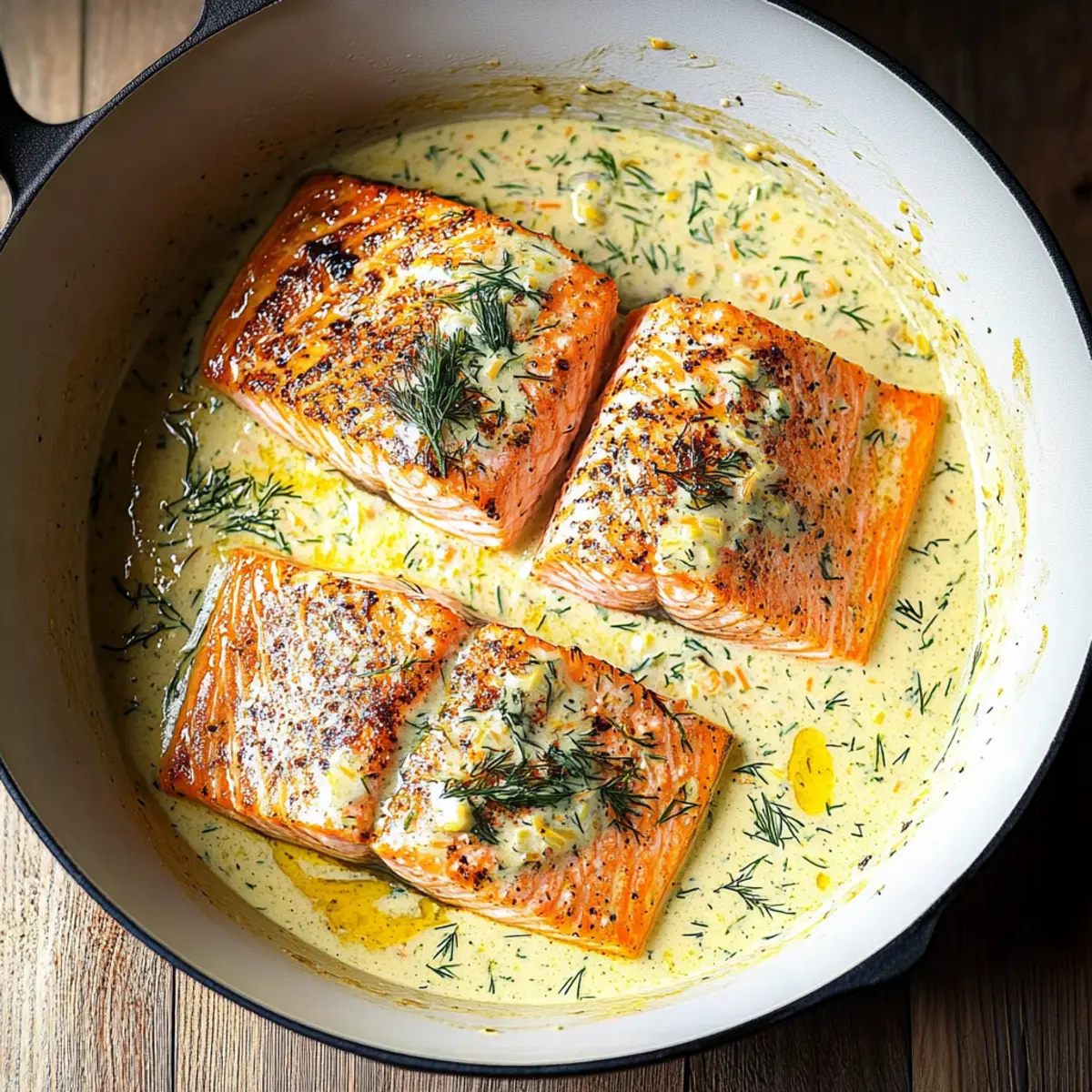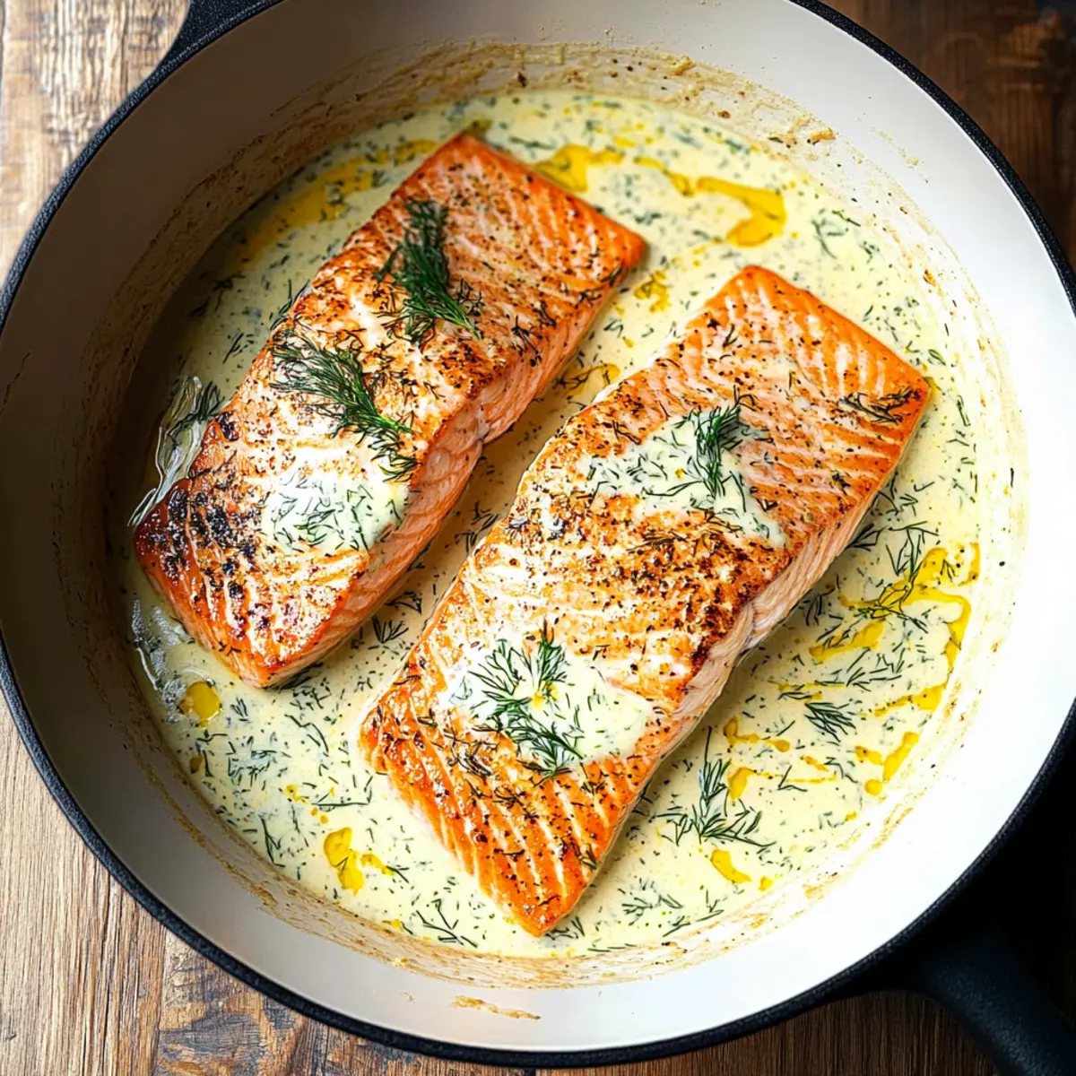 - Return the seared salmon fillets to the skillet, nestling them in the creamy dill sauce. Allow them to simmer together for about 3 minutes, ensuring the salmon is heated through.