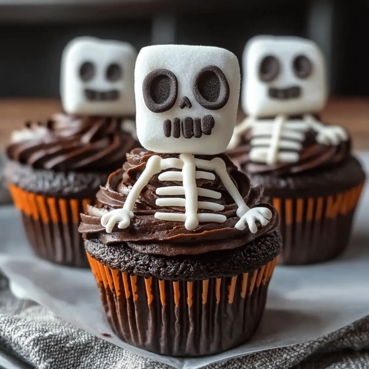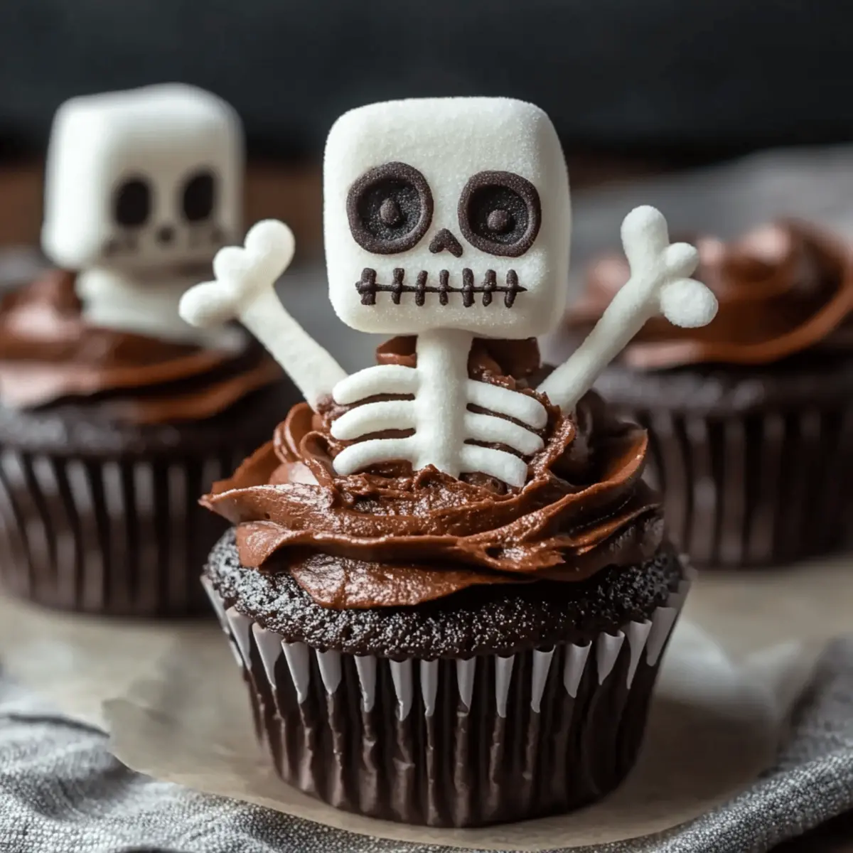Once the cupcakes have cooled, generously frost each one with chocolate frosting using a spatula or piping bag. Aim for a thick, even layer that creates a smooth surface to support your skeleton décor. The contrasting colors of the dark frosting against the cupcakes will enhance the Halloween charm of your Skeleton Cupcakes.