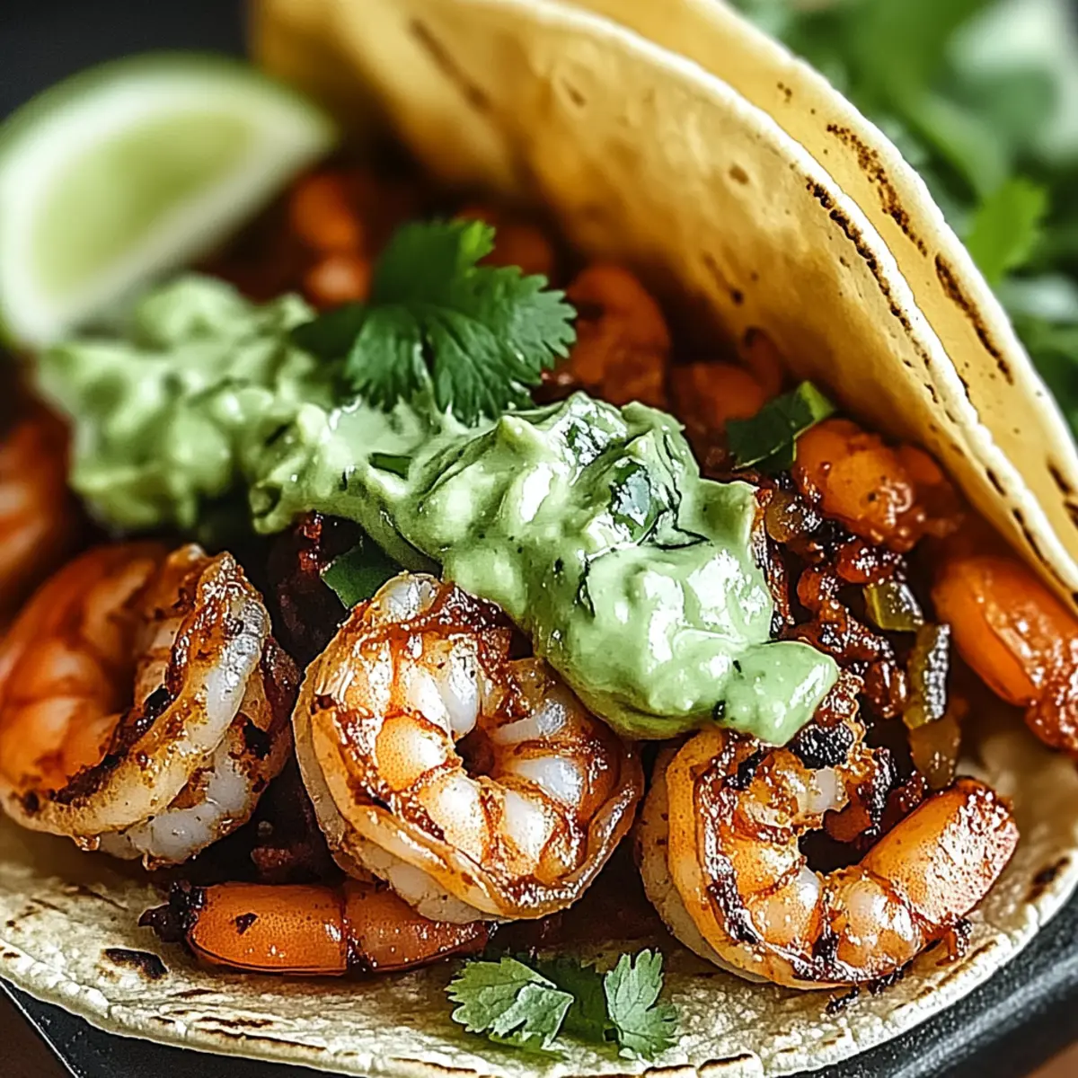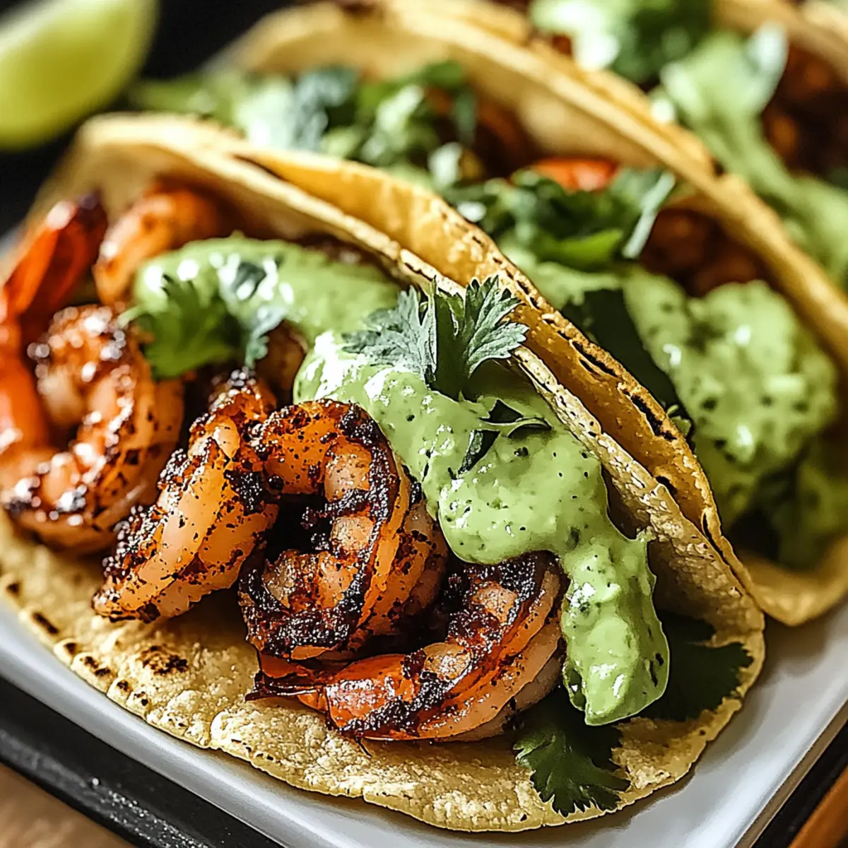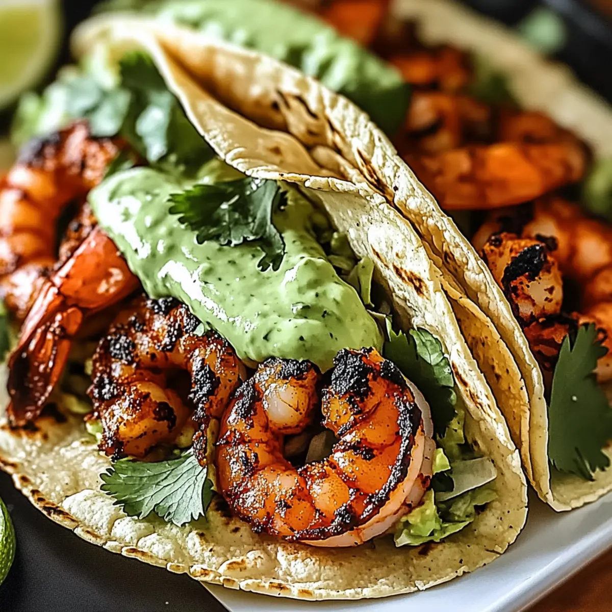 - Assemble the tacos by layering shredded cabbage on each tortilla, adding shrimp on top, drizzling with avocado crema, and garnishing with cilantro and lime juice.