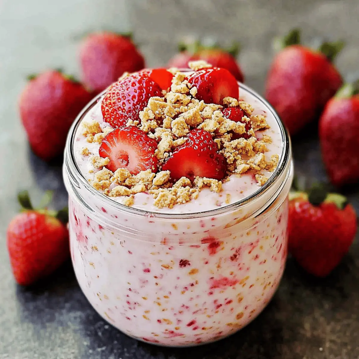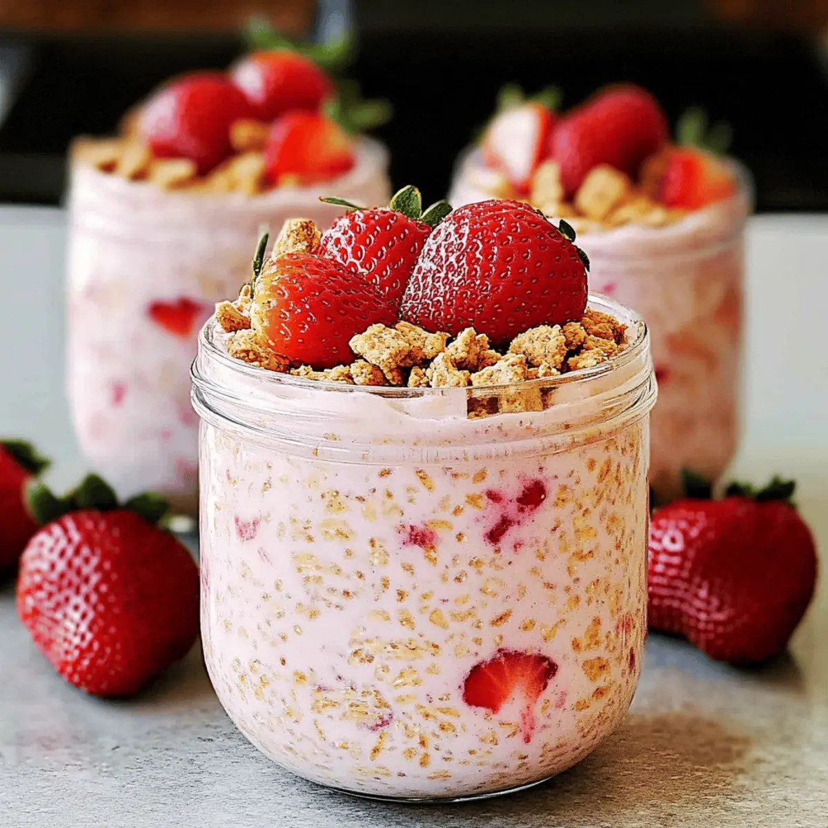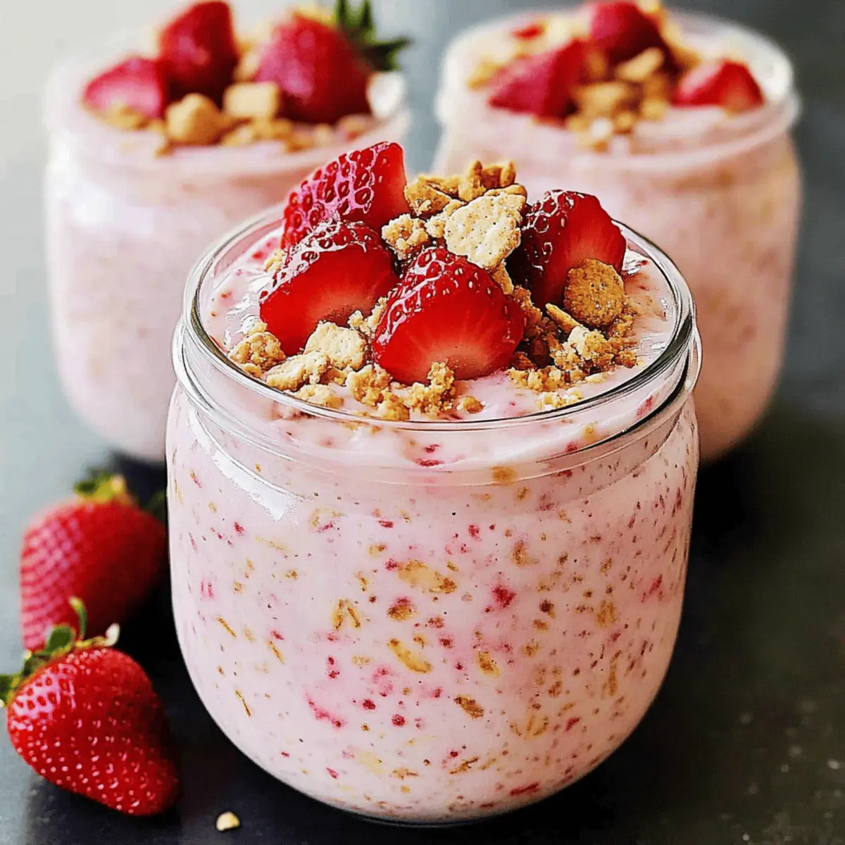 Strawberry Cheesecake Overnight Oats are a fantastic choice for meal prep, saving you time during those busy mornings! You can prepare the entire mixture up to 24 hours in advance by combining your rolled oats, almond milk, Greek yogurt, cream cheese, honey, and vanilla, and then gently fold in the chopped strawberries and chia seeds. Store the mixture in airtight containers in the refrigerator for up to 3-5 days to maintain fresh quality. Just remember to add the toppings, such as crushed graham crackers or granola, right before serving for the best texture and crunch. With this prep, you’ll enjoy a delightful, creamy breakfast that feels like indulgence with minimal effort!