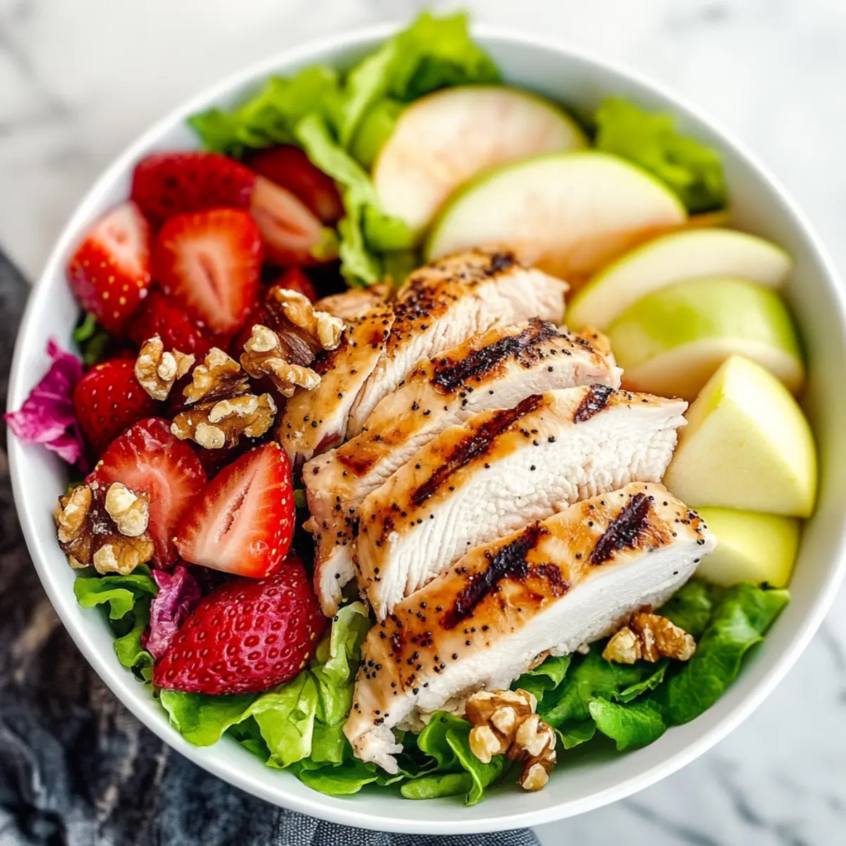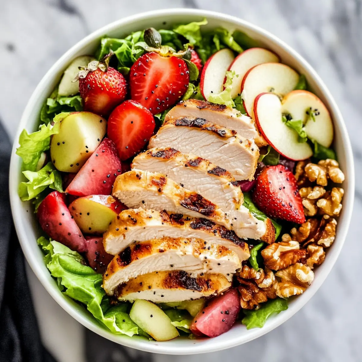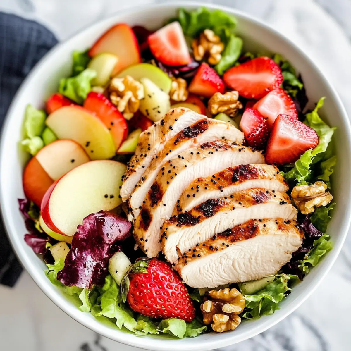 Now it’s time to crown your salad! Arrange the sliced chicken over the top of the salad. Drizzle your favorite creamy poppyseed dressing generously over everything. If you love an extra pop of flavor, feel free to add a splash of raspberry vinaigrette to complement the strawberries beautifully.