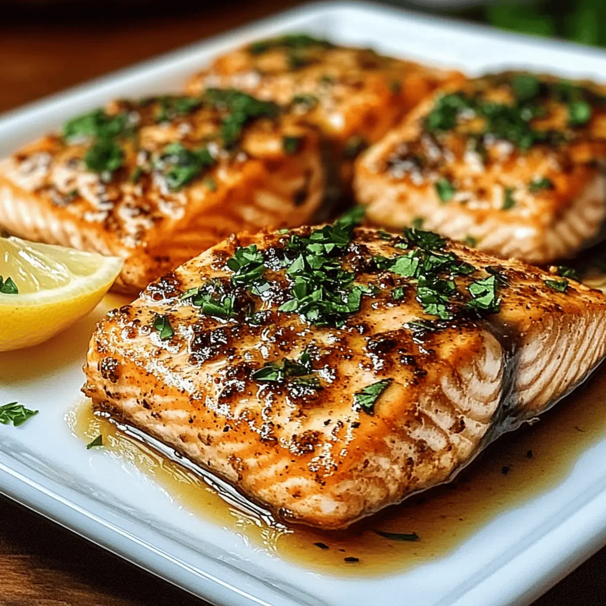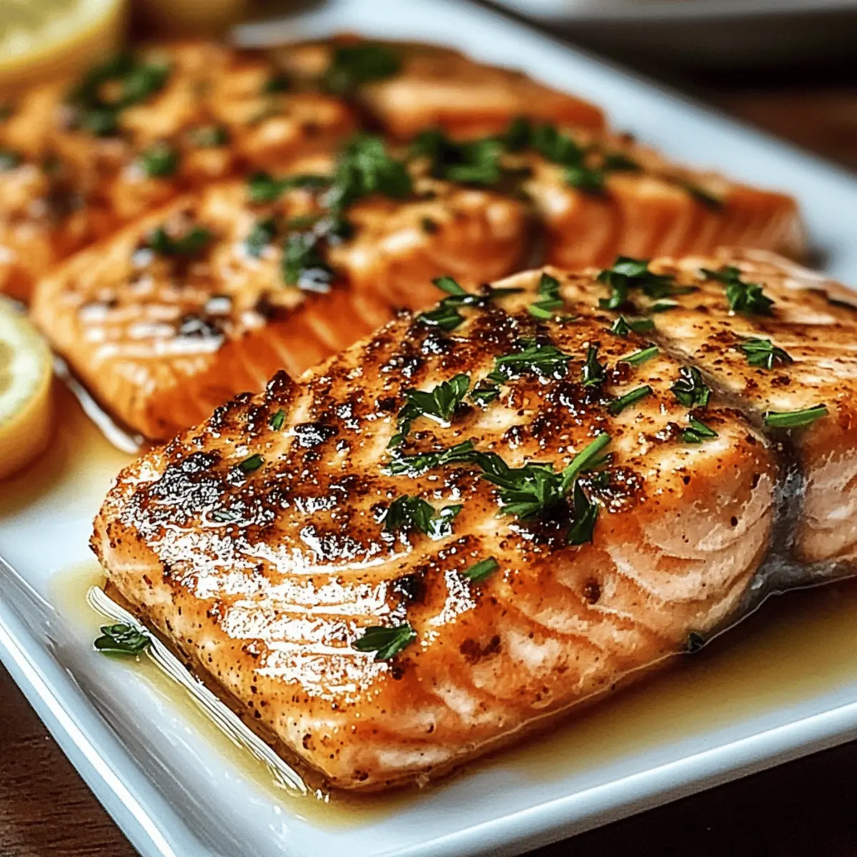 Once baked, remove the salmon from the oven and let it rest for a few minutes. This resting period allows the juices to redistribute, ensuring moist fillets. After resting, sprinkle freshly chopped parsley over the salmon for a pop of color and serve with additional lemon slices for a refreshing touch.