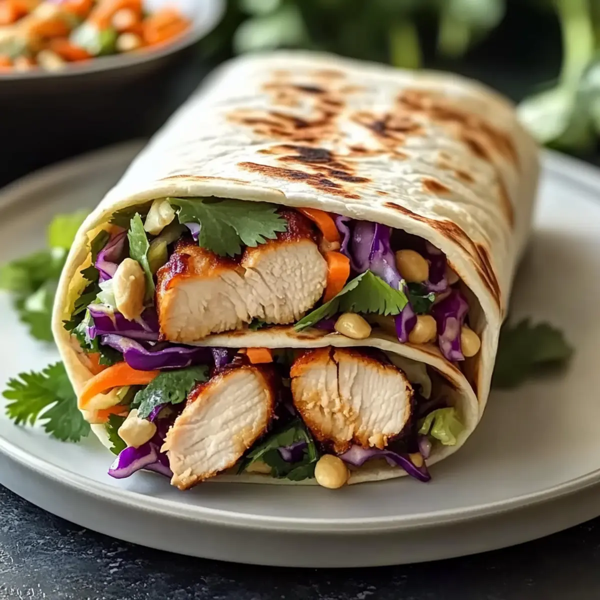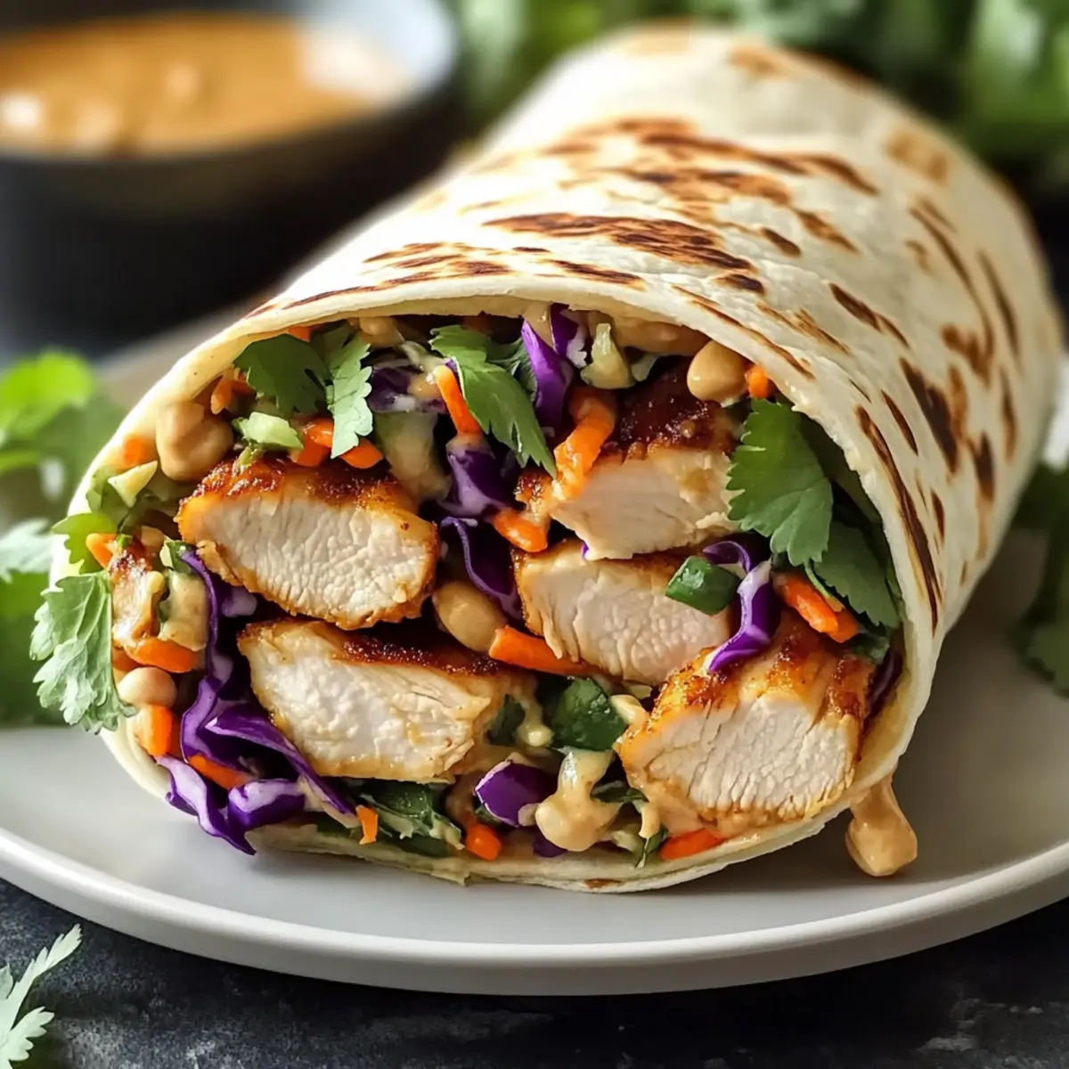Warm the flour tortillas in a dry skillet or microwave to make them pliable. On each tortilla, spread a generous layer of the peanut sauce, followed by a handful of the crunchy slaw and sliced chicken. Drizzle additional peanut sauce on top, garnish with extra cilantro and chopped peanuts if desired, then tightly roll the tortilla to form your beautiful Thai Chicken Wrap with Crunchy Asian Slaw.